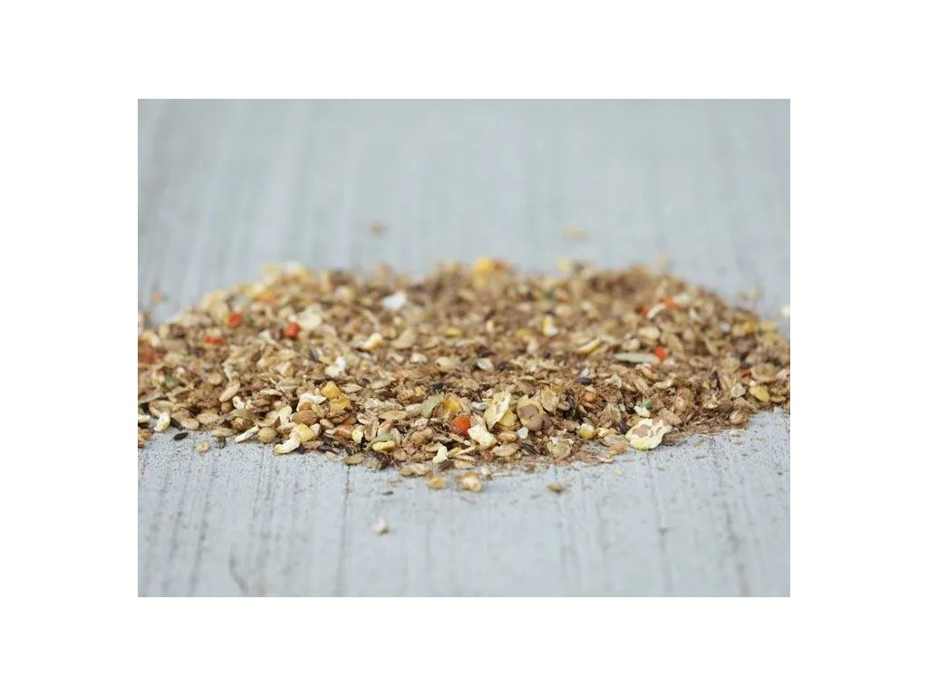 Zloženie: Jačmenné vločky, pšeničné otruby, ľanové semienko, ovos, expandovaný jačmeň a kukurica, melasa, opracované sójové bôby, vločky z konských bôbov, mrkvové kúsky, pór, frukto-oligosacharidy, slnečnicové semená a minerálne látky.