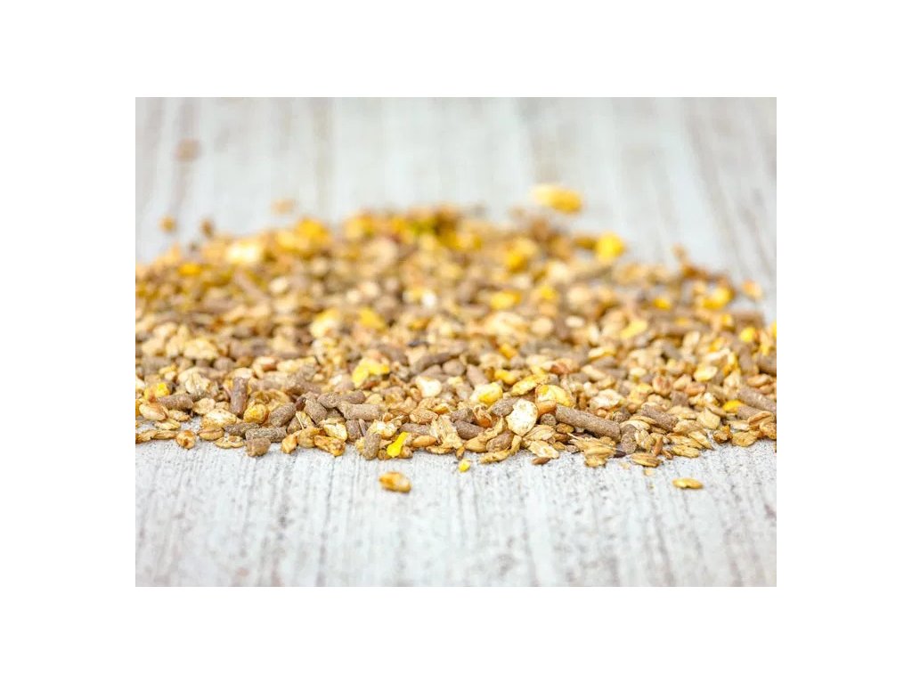Zloženie: Jačmenné vločky, ovos, pšeničné otruby, šupky ľanových semien, expandovaná kukurica a jačmeň, melasa, kukuričné otruby, slnečnicové semeno, ľanové semienko, pšeničný lepok, jačmeň, sójový olej, lucerna, uhličitan vápenatý, šupky sójových bôbov, pšenica a kukuričný lepok.