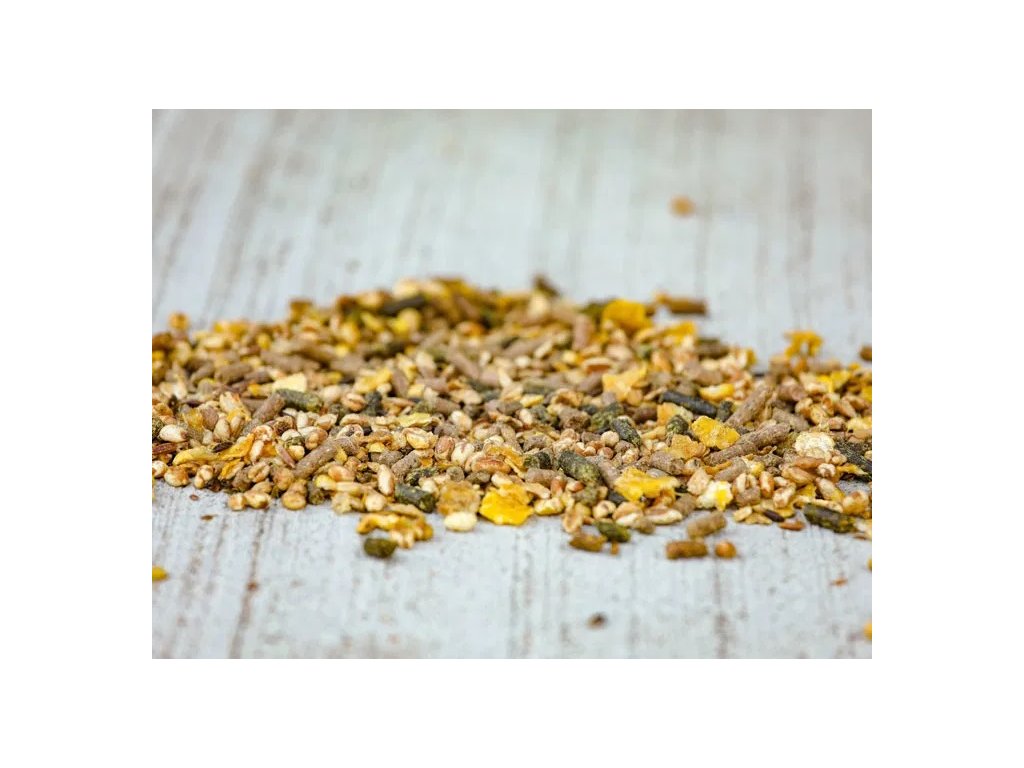 Zloženie: Pšeničné otruby, jačmenné vločky, lucerna, ovos, kukuričné vločky, ľanové šupky a semienko, kukuričné otruby, opracované sójové bôby, melasa, slnečnicové semeno, špalda, sójový olej, expandovaná kukurica, repná dužina, frukto-oligosacharidy, minerálne látky a vitamíny.