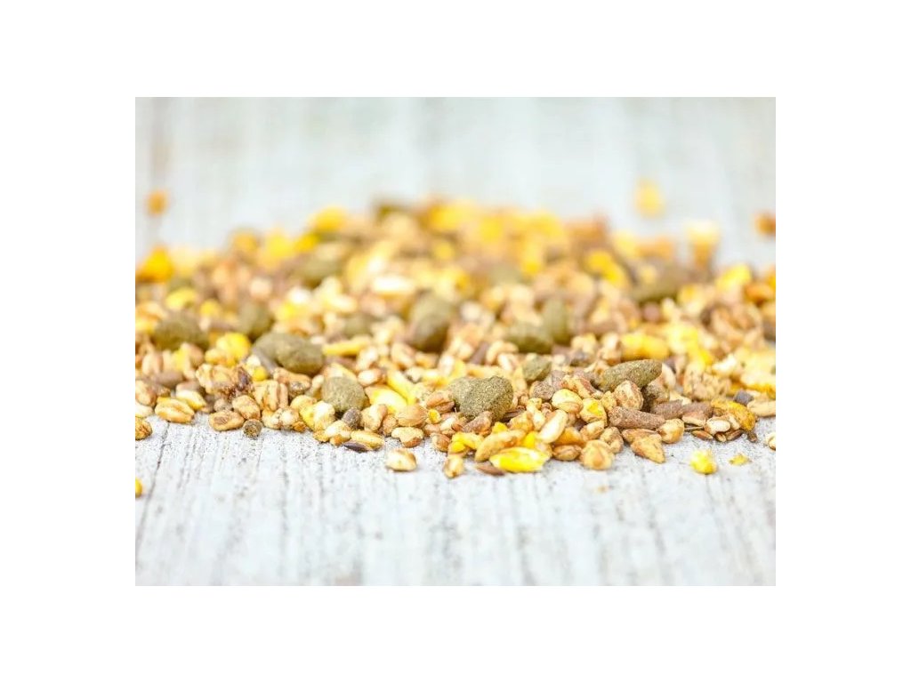 Zloženie: Ovos, pšeničné otruby, expandovaná kukurica, šupky z ľanových semien, pšeničná múka, opracované sójové bôby, melasa, jačmeň, slnečnicové semeno, kukuričné otruby, pivovarské kvasnice, uhličitan vápenatý, sója a minerálne látky.