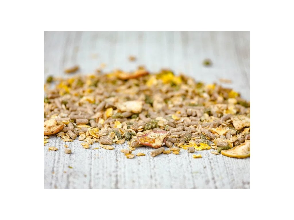 Zloženie: Jačmenné vločky, pšeničné otruby, lucerna, kukuričné otruby a vločky, slnečnicové semená, melasa, jačmeň, pšeničný lepok, uhličitan vápenatý, plátky sušených jabĺk (0,5 %), sójový olej, frukto-oligosacharidy.